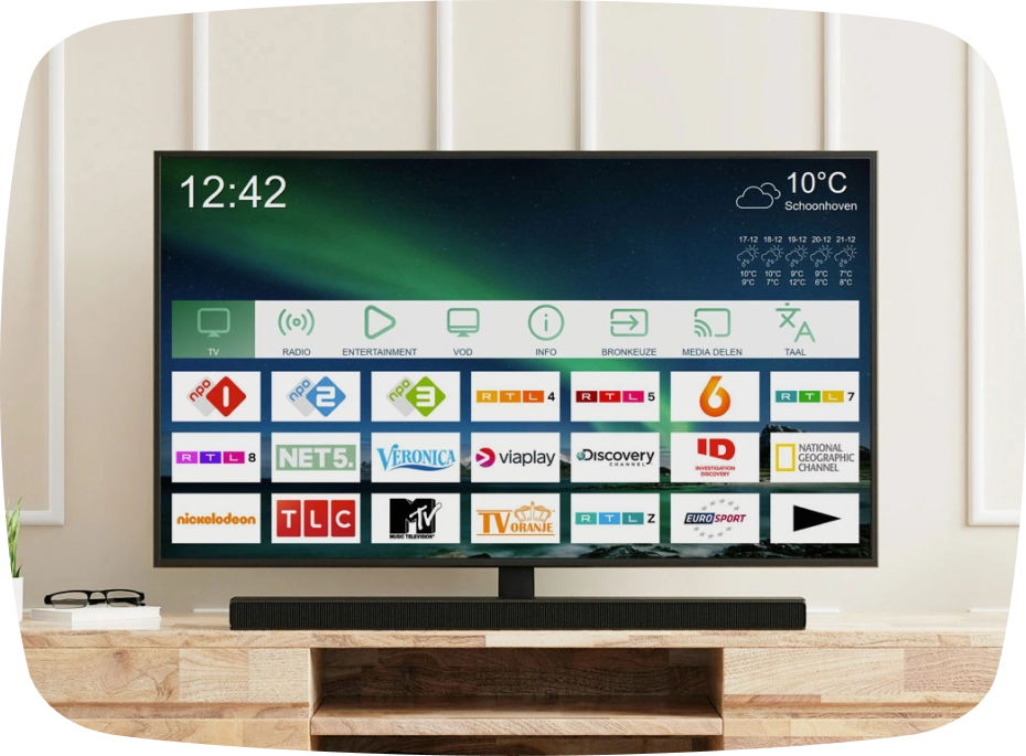 Wij sluiten alles aan en zorgen dat het werkt. Zodat bewoners meteen kunnen kijken. Werkt iets niet? Dan zijn we altijd bereikbaar en lossen we het op.